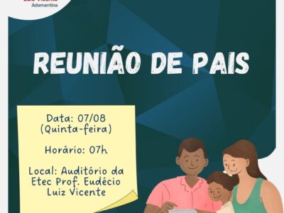 Senhores Pais ou responsável, O diretor da ETEC Prof. Eudécio Luiz Vicente CONVIDA Vossa Senhoria para reunião de pais, que acontecerá no dia 07/08 (quinta feira), às 7h, no auditório da ETEC. PAUTA: Ciência dos […]