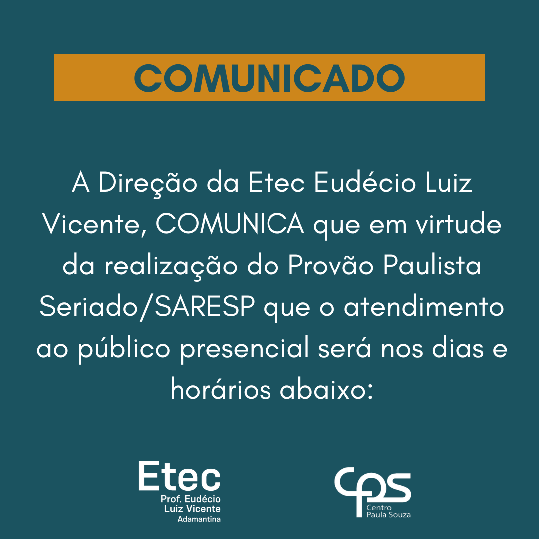 A Direção da Etec Eudécio Luiz Vicente, COMUNICA que em virtude da realização do Provão Paulista Seriado/SARESP que o atendimento ao público presencial será nos dias e horários abaixo: