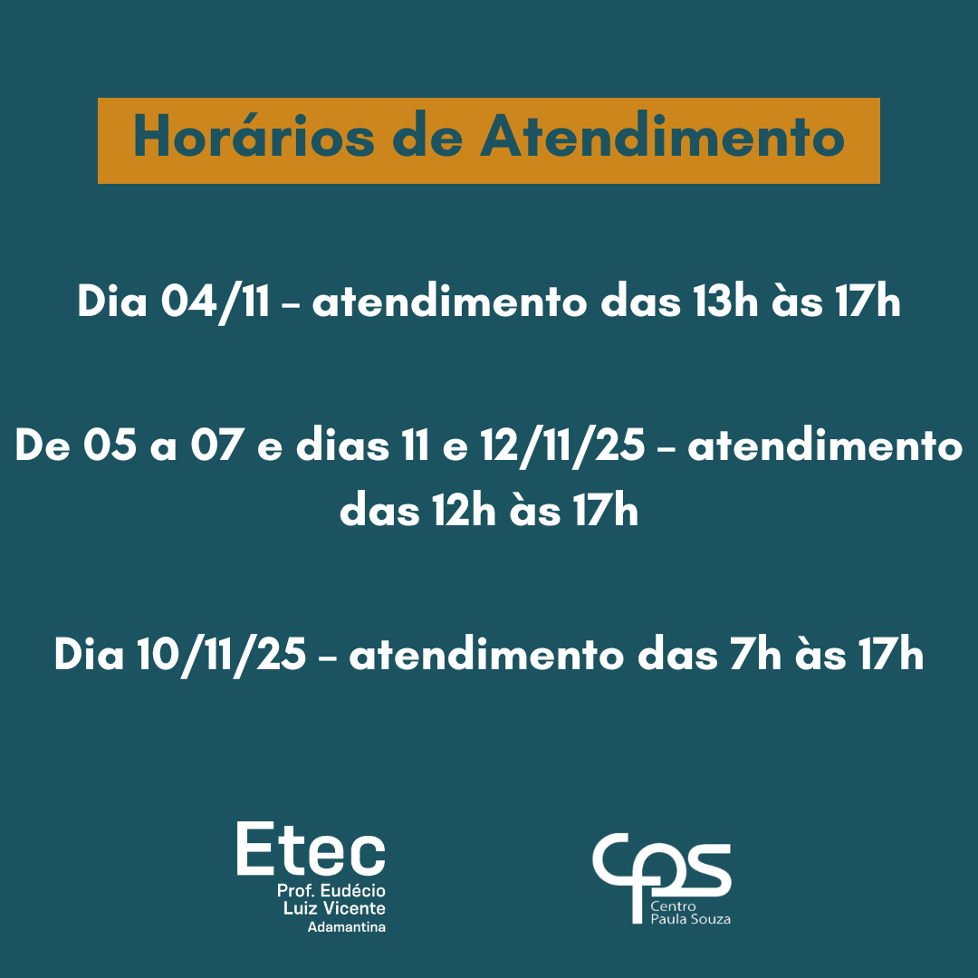 A Direção da Etec Eudécio Luiz Vicente, COMUNICA que em virtude da realização do Provão Paulista Seriado/SARESP que o atendimento ao público presencial será nos dias e horários abaixo: No período de 03 a 12/11/25 […]